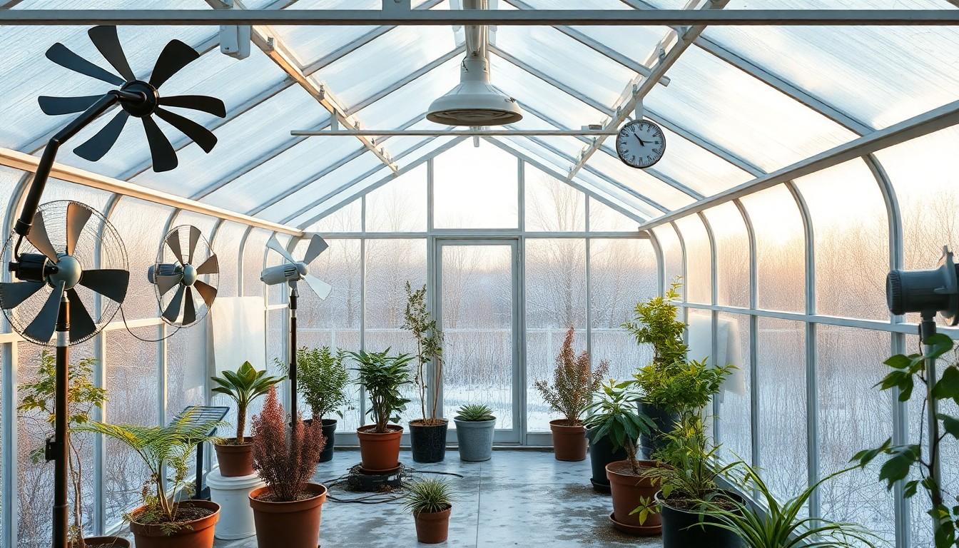 Install circulation fans, maintain proper spacing between plants, and keep air intake vents clear. Combine ventilation with heating and use automatic vent openers. Remove standing water promptly and monitor humidity levels with a hygrometer.